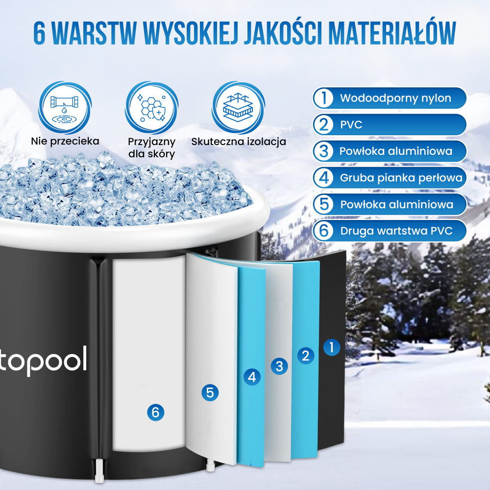Basen do morsowania Topool wyróżnia się wysoką jakością wykonania i trwałością. Wykonany został z sześciu warstw izolacyjnych, w tym materiału oxford, PVC, organicznej bawełny oraz wytrzymałego poliestru i nylonu, co sprawia, że utrzymuje niską temperaturę wody przez dłuższy czas. Nadmuchiwany pierścień górny zwiększa komfort użytkowania, pozwalając na wygodne oparcie ciała w trakcie kąpieli lodowej. Solidny, a jednocześnie lekki stelaż z rurek montażowych gwarantuje stabilność, a jednocześnie umożliwia łatwy i szybki montaż w kilka minut. Dzięki temu wannę można rozłożyć w dowolnym miejscu – w ogrodzie, na balkonie, na tarasie lub nawet wewnątrz domu. Mobilność produktu sprawia, że jest to idealny wybór dla osób ceniących wygodę, funkcjonalność i możliwość użytkowania w różnych warunkach.