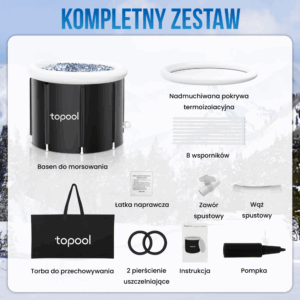 Kupując wannę do morsowania Topool, otrzymujesz kompletny zestaw, który pozwala rozpocząć przygodę z zimnymi kąpielami od razu po rozpakowaniu produktu. W zestawie znajduje się pompka ręczna do napełniania pierścienia powietrzem, rurki stelażowe zapewniające stabilność, zawór spustowy oraz rurka ułatwiająca opróżnianie wody. Dołączone są także pierścienie uszczelniające, łatka naprawcza oraz praktyczna torba ortalionowa, która umożliwia wygodne przechowywanie i transport. Niezwykle istotnym elementem zestawu jest pokrywa termoizolacyjna, która chroni wodę przed zanieczyszczeniami oraz utratą niskiej temperatury. Dzięki szczegółowej instrukcji obsługi w języku polskim montaż wanny jest prosty i nie wymaga żadnych specjalnych narzędzi. To idealny wybór zarówno dla osób rozpoczynających swoją przygodę z morsowaniem, jak i dla doświadczonych entuzjastów zimnych kąpieli.